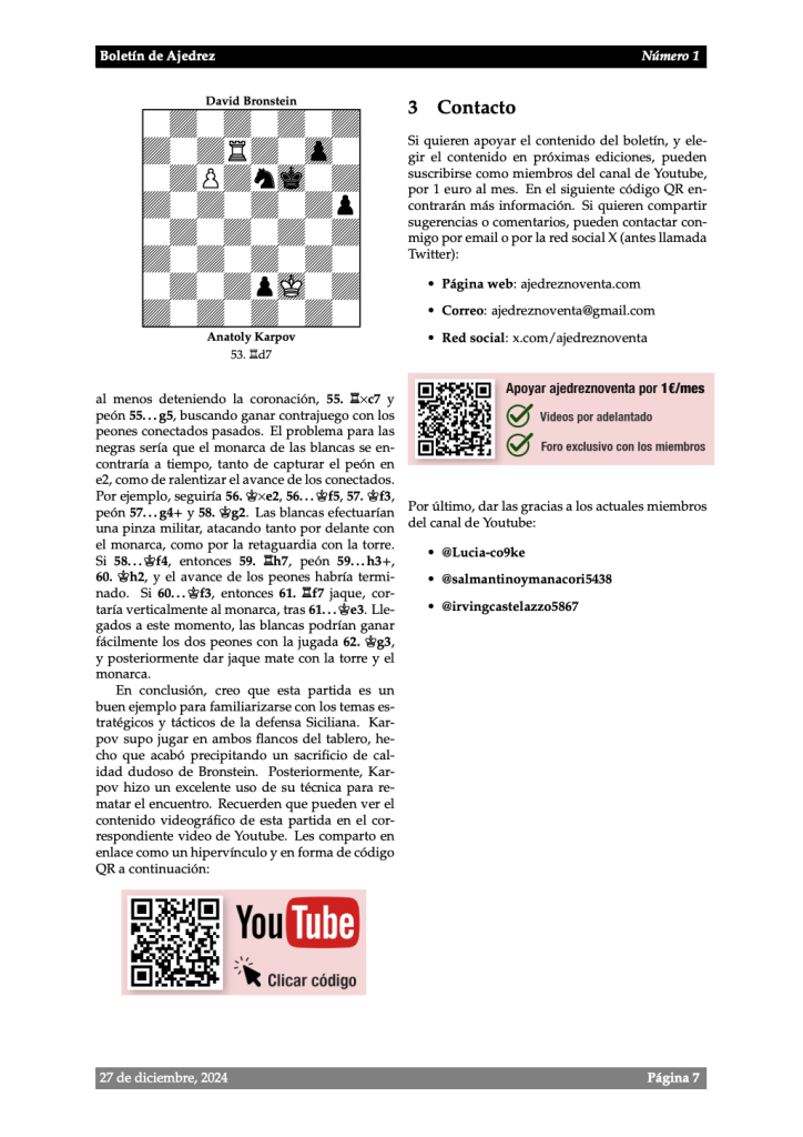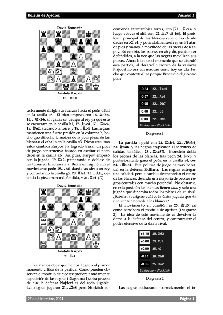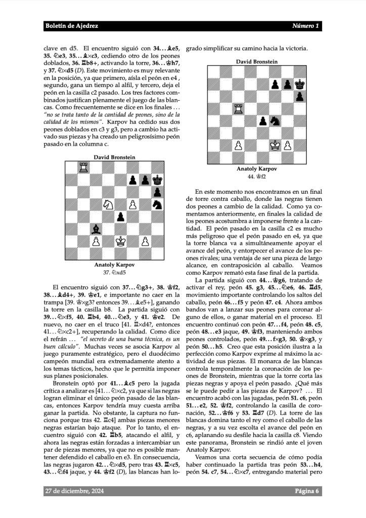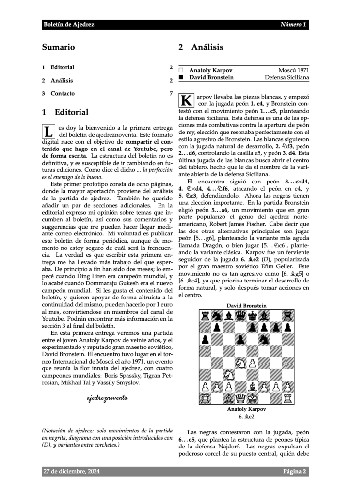 En esta sección pueden descargar gratuitamente el boletÃn de ajedrez, donde podrán encontrar una partida de ajedrez analizada movimiento a movimiento. Mi intención es publicar este boletÃn de forma periódica, aunque no estoy seguro de qué frecuencia deberÃa adoptar para que la publicación sea sostenible.